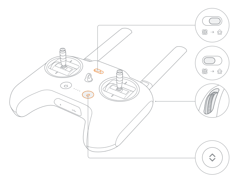 4. When the auto take-off/land button flashes white light, the aircraft is ready for auto taking off and landing.When the aircraft is ready for taking off, press the auto take-off/land button, and press again and hold for 2 seconds to fly the aircraft.When the aircraft is ready for landing, press the auto take-off/land button, and press again and hold for 2 seconds to land the aircraft.